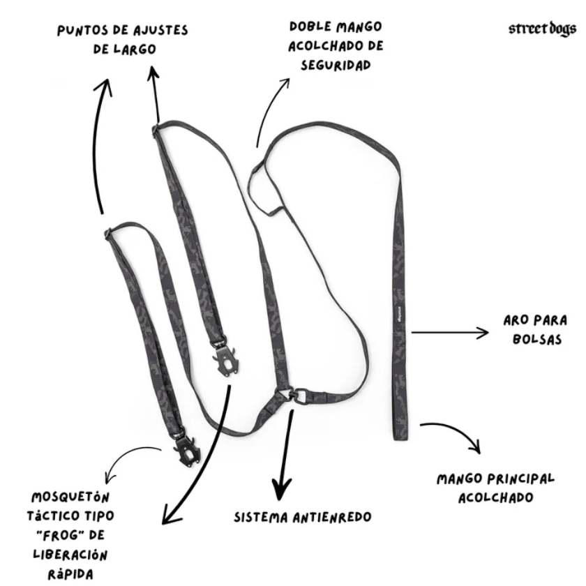 Ya sea que pasees a un travieso cachorro 🐶 o a dos perros adultos llenos de energía 🐕🐕, la Street Dogs Black Camouflage es la solución perfecta para mantener el paseo cómodo, seguro y personalizado para cada necesidad. 🌟