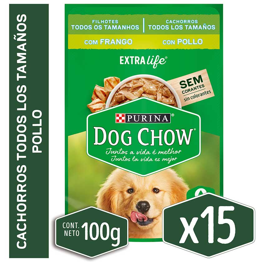 alimento húmedo para perro dog chow® cachorros con pollo sobre 100gr pack 15 unidades descripción alimento húmedo completo y balanceado para perros cachorros de todos los tamaños dog chow® con pollo. sin colorantes. con extralife, una mezcla especial con antioxidantes, vitaminas y minerales para maximizar su calidad de vida. dog chow, comida perro, alimento húmedo, cachorros, perro, alimento húmedo perro, alimento perro, cachorro, sin colorantes, pollo. beneficios - rico premio para tu mascota, se lo puedes dar directo o mezclar con el alimento diario. - con calcio para dientes fuertes - sin adición de conservantes artificiales - con extralife: una mezcla especial con antioxidantes, vitaminas y minerales para maximizar su calidad de vida. - contribuye a la hidratación diaria. - sin colorantes.