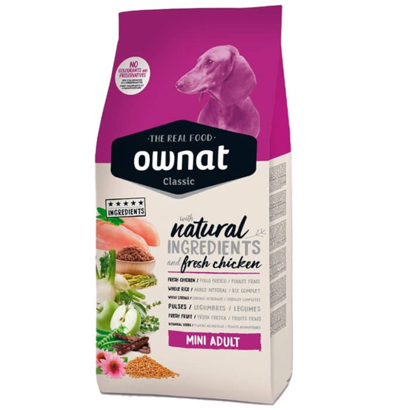 La mejor nutrición para perros adultos de razas pequeñas. Con un 34% de carnes frescas y deshidratadas, cereales integrales, frutas y hierbas naturales, Ownat Classic Mini Adult está formulado para cubrir las altas necesidades energéticas de los perros mini, favoreciendo su digestión, reforzando sus defensas y manteniendo su vitalidad cada día.