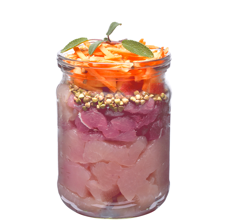 ingredientes: 48% de pollo, 28% de pavo, 11% de caldo, 4.5% de batata, 2% de manzana, 2% de minerales, 1.3% de trigo sarraceno, 1% de mezcla de hierbas (romero, tomillo, caléndula, diente de león), 1% de aceite de salmón, 0.5% de perejil, 0.5% de linaza, 0.2% de algas y grosella negra componentes analíticos: proteína cruda 8%, contenido de grasas 6.5%, ceniza cruda 2.5%, humedad 75.0%, fibra cruda 0.7%, calcio 0.3%, fósforo 0.2%, sodio 0.4% composición nutricional: vitamina d3 (e671) 250 iu, vitamina e (3a700) 150 mg, zinc (3b606) 15 mg, hierro (3b103) 12 mg, manganesio (3b502) 3 mg, yodo (3b201) 0.75 mg, cobre (e4) 0.5 mg, biotina (3a880) 0.2 mg