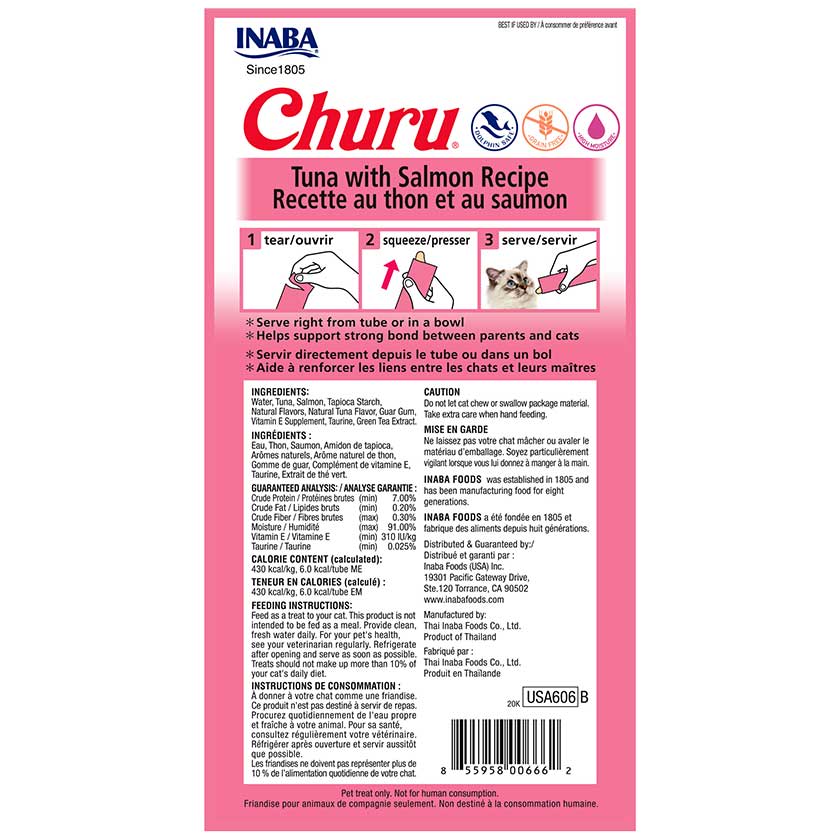 ingredientes: agua, atún, tapioca, salmón, saborizantes naturales, goma guar, colágeno, vitamina e, extracto de té verde. componentes y niveles analíticos: proteína 7%, grasa 0,2%, fibra 0,3%, humedad 91%, vitamina e 310 ui/kg contenido calórico: 430 kcal/kg, 6 kcal/tubo.