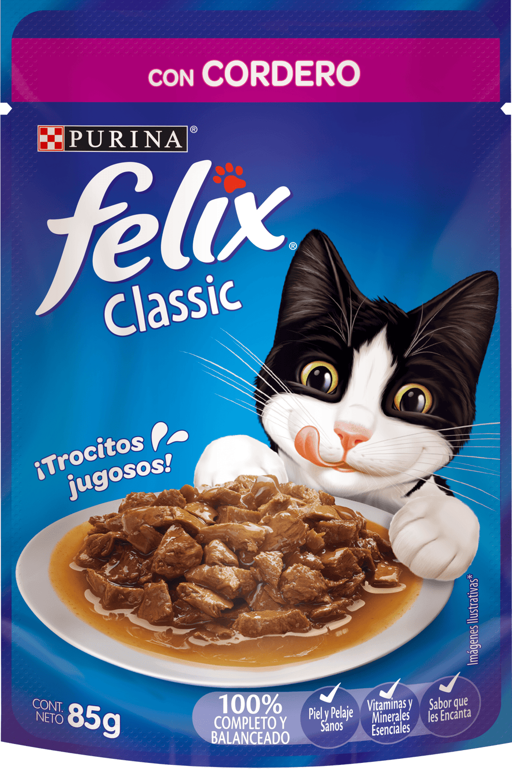 Felix Adultos Cordero en Salsa Alimento húmedo Descripción Es una gama de variedades de alimento húmedo con tiernos trocitos de carne o pescado o pollo con una deliciosa salsa que le dará un sabor irresistible. Las diferentes variedades de Felix ® combinan sabores y texturas únicas, como el pate de salmón o los filetitos de pescado y atún en salsa. Su olor, sabor y apariencia serán irresistibles para tu gato por lo que hará las cosas más ingeniosas para conseguirlo. Así que si tienes la suerte de tener un gato astuto como Felix ® , ¡sorpréndelo con las diferentes combinaciones sabrosas todos los días!