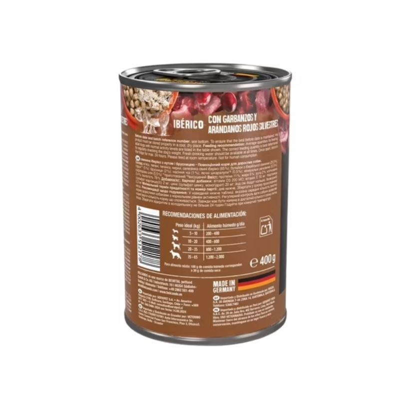 Alimento húmedo premium alemán elaborado con cerdo ibérico de alta calidad, ideal para perros adultos que necesitan nutrición completa, alta palatabilidad y fácil digestión.