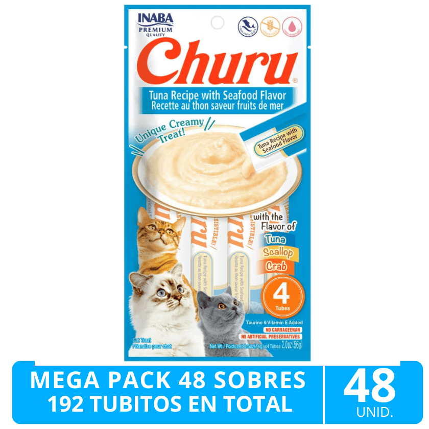 mega pack 40 sobres inaba ciao churu atún y mariscos (192 tubitos). descripción ciao churu atún y mariscos, es un novedoso y delicioso snack para gatos de textura cremosa (puré) y alta palatabilidad. tiene un alto contenido de humedad lo que encanta a los gatos y además contribuye a su hidratación. cada sobre contiene 4 tubitos de 14 gr c/u (total 56 gr). lleva 48 sobres (192 tubitos). libre de granos, sin conservantes ni colorantes artificiales.