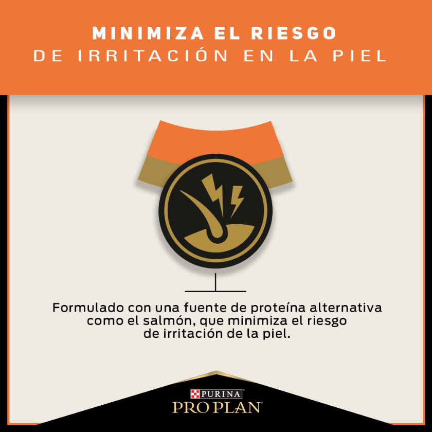purina pro plan adulto raza mediana y grande sensitive skin salmon 12 kg. con propiedades del salmón para minimizar el riego de irritación de la piel en perros adultos de razas medianas y grandes. descripción purina® pro plan® adult sensitive skin con optiderma® formulado por veterinarios y nutricionistas para satisfacer las necesidades especiíficas de perros adultos con piel sensible. purina® pro plan® sensitive skin con optiderma® es una tecnología de vanguardia para perros adultos de piel sensible. cuenta con un fuente alternativa de proteínas proveniente del salmón para minimizar la probabilidad de enfrentar al perro hipersensible a diferentes alérgenos. beneficios purina® pro plan® adult sensitive skin es una dieta de alta tolerancia que no contiene alérgenos comunes. formulado con proteínas limitadas y seleccionadas como el salmón, para minimizar el riesgo de irritación de la piel asociada con la sensibilidad alimentaria común. también tiene un nivel optimizado de ácidos grasos omega 3 y 6, vitaminas, antioxidantes, cobre y zinc, que refuerzan la protección de la piel y promueven un pelaje más flexible y brillante. pelaje lustroso alto contenido de ácidos grasos omega 3 y 6 que refuerzan la protección cutánea y promueven una piel saludable y un pelaje lustroso, más vitaminas y minerales que nutren la salud del pelaje. sistema digestivo saludable
