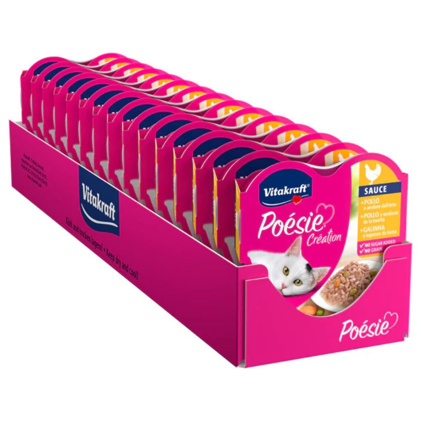 vitakraft poesie creation sabor pollo 85gr descripción bocados abundantes y carnosos, apetitosamente preparados con deliciosas verduras en una salsa sofisticada : ¡este delicioso menú en envase de corazón es un poema de sabor para tu gato todos los días! cada plato de poésie® création contiene un sabor irresistible, los mejores