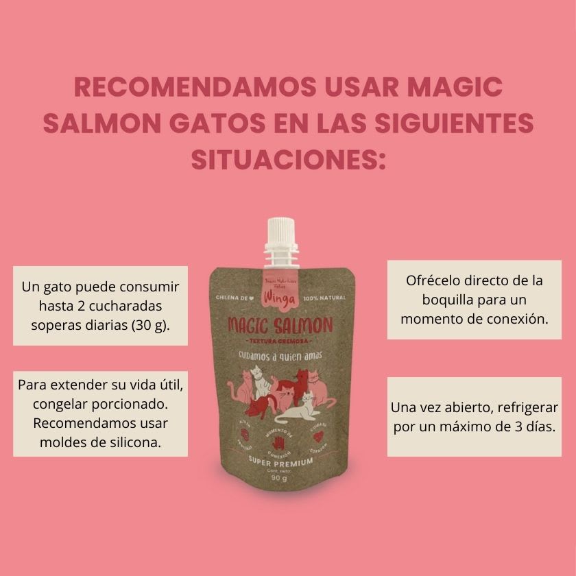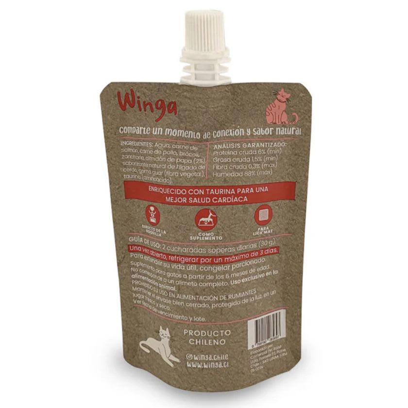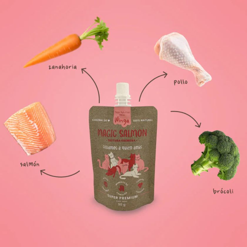 winga magic salmón snack para gatos 60gr descripción pouch de salmón para gatos con textura suave y untable, ideal para consumo directo de la boquilla. función: una combinación deliciosa de salmón y pollo, que además cuida la salud cardíaca de tu gato gracias a la taurina. necesidad: ideal para gatos que disfrutan de sabores exquisitos y necesitan un aporte nutricional de alta calidad. características: alto en proteínas de primera calidad. monoprotéico, sin cereales, soya, maíz, trigo, gluten u otros
